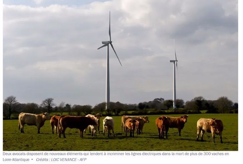 Des vaches perturbées par les lignes électriques des champs d'éoliennes. Certaines en meurent dans l'Ouest de la France. Deux avocats portent plainte et Radio France a enquêté.[Deux avocats disposent de nouveaux éléments qui tendent à incriminer les lignes électriques dans la mort de plus de 300 vaches en Loire-Atlantique]